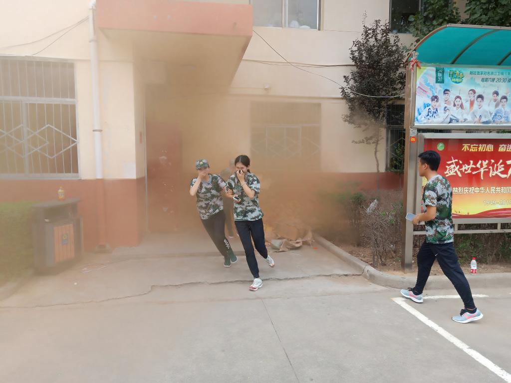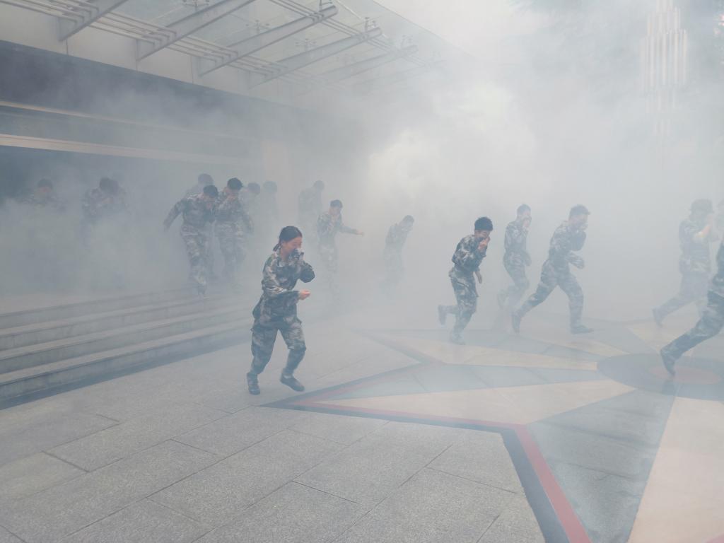 演练开始前,(处)多次与承训教官和有关部门沟通协调,制定了科学可行的活动方案,并在校本部和沣峪校区的教学楼内设置突发火灾的模拟场景,以达到良好演练效果。演练正式开始后,工作人员释放烟雾弹模拟火情,教学楼内外弥漫着烟雾,在承训教官的统一指挥协助下,学生按照逃生动作轻捂口鼻、弯腰躬身,按预定的疏散路线从教学楼迅速撤离,整个演练过程紧张但又有条不紊。