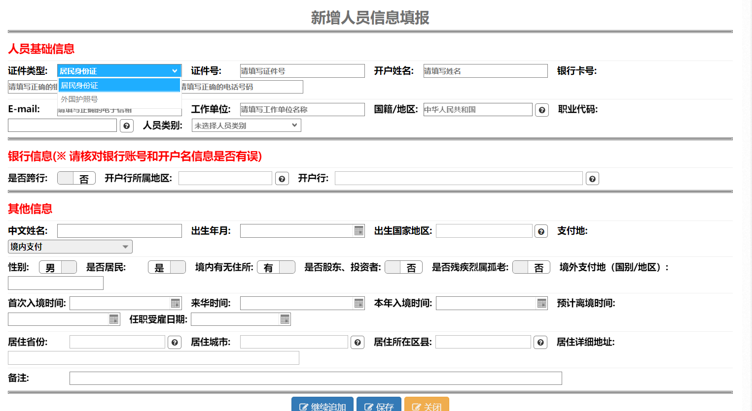 证件类型用于区分国内居民和外籍人员,选择居民身份证,人员基础信息里则需要维护证件号、开户姓名、银行卡号、手机号、工作单位、国籍等信息。银行信息非校内工资卡所属行的则为跨行,是否跨行与开户行所属地区,开户行均需选择。如下图: