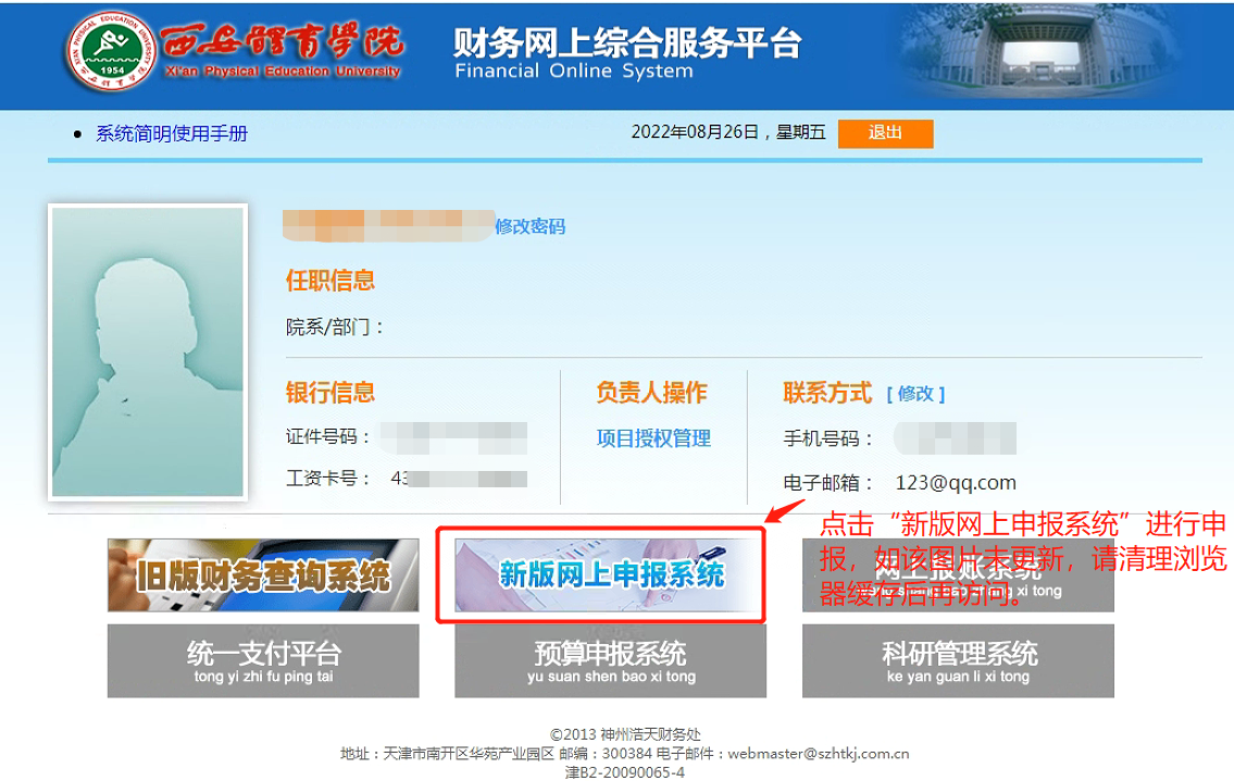 各业务经办人通过西安体育学院财务处官网“财务网上综合服务平台”进入以下页面后,如下图所示: