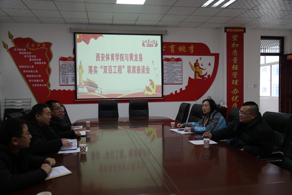 1月18日,西安体育学院与黄龙县2020年第一次“双百工程”联席座谈会在黄龙县教育科技体育局召开。西安体育学院党委、校长办公室副主任耿潇,体育经管学院副院长杨涛,黄龙县教科体局副局长董玉平,县学生资助管理中心主任解飞虎等同志参加,会议由县教研室主任解虎灵主持。