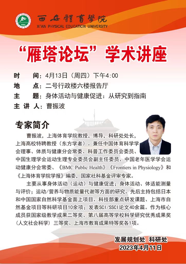 为贯彻落实《西安体育学院“2023学科建设年”实施方案》精神,推动我校学科建设高质量发展,营造良好的学术氛围,兹定于4月13日(周四)举办“雁塔论坛”学术讲座,有关事宜通知如下: