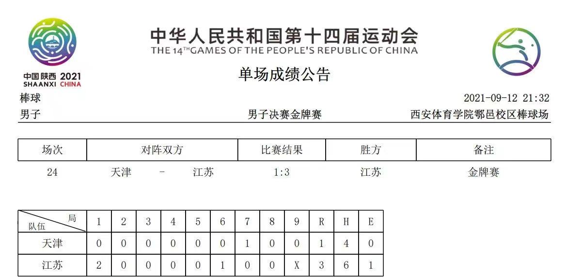 第十四届全国运动会棒球决赛阶段9月12日晚在陕西省西安体育学院鄠邑校区棒球场落下帷幕,经过激烈争夺,卫冕冠军天津队决赛以1:3憾负实力不俗的江苏队,屈居亚军,这也是首次闯进全运会决赛的江苏棒球队,队史上首次夺得全运会冠军。