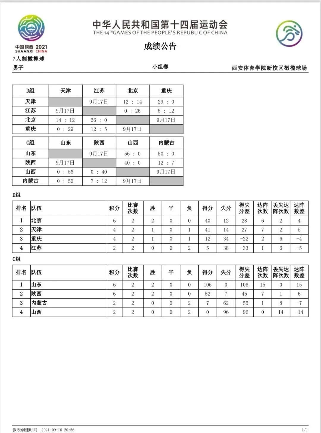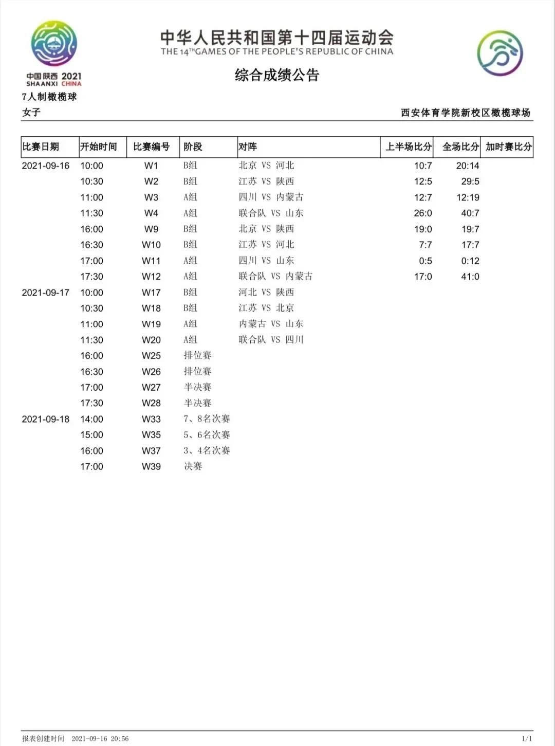 9月16日,第十四届全国运动会7人制橄榄球比赛在西安体育学院新校区橄榄球场开赛。本次比赛有来自全国10个省市的16支参赛代表队角逐男、女项目金牌。