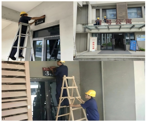 为确保工作高效有序并最大限度减少对学生的影响,管委会组织维修团队精准把握施工窗口期,主要利用学生上课时段进行安装。维修人员克服困难,携带专业设备逐楼作业,确保每个新号牌安装位置准确、牢固可靠且无安全隐患,高效完成全部楼栋标识 的更新任务。