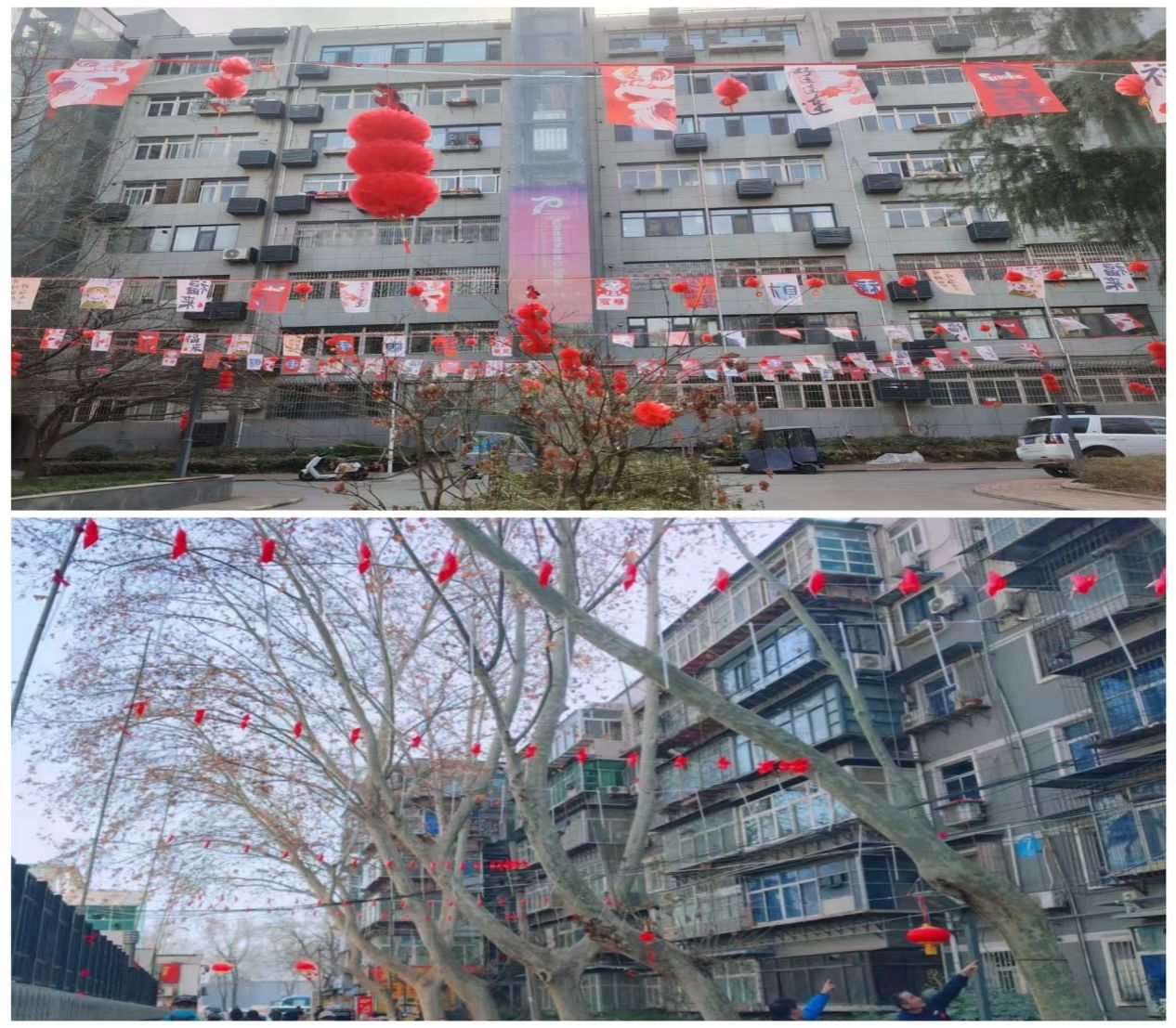 本次装点以安全美观、节能温馨、文化赋能为原则,重点打造院区出入口、主干道等核心区域。工作人员分工协作、细致施工,从提交装点方案--物品采买—组装零件—现场布置,每一名员工不畏辛苦,欢欢喜喜的进行春节装点。在十号楼前装点彩旗与彩灯、红灯笼与马年主题装饰,每个灯杆上挂上大红灯笼,家属区东门悬挂风车、流星雨彩灯等,整体氛围庄重热烈、雅致温馨。夜幕降临,灯火交映,园区处处流光溢彩,年味十足。