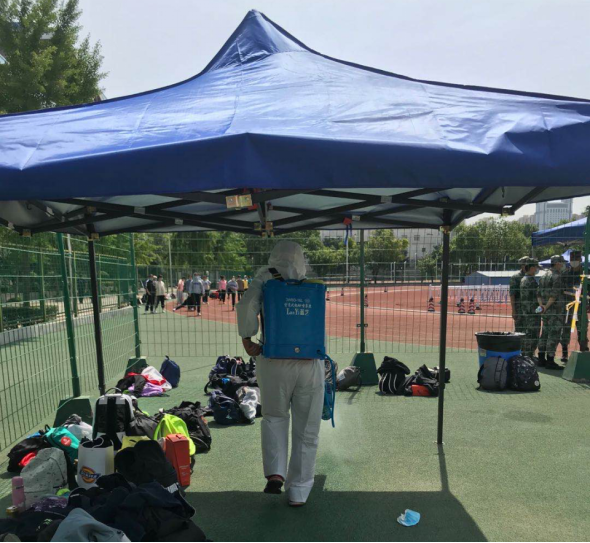 考试用卫生间(田径场、综合馆1层、篮球场)消杀4次;