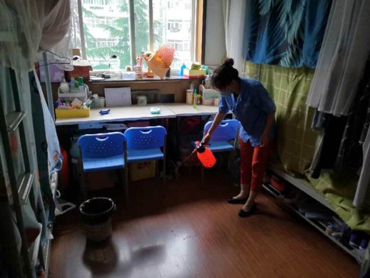 (一)后勤管理处(集团)学生公寓管理中心在对工作人员进行体温检测、登记后,严格按照校医院《学生公寓消毒指南》要求做好学生公寓清洁、消毒每日2次,通风工作每日3次,每次30分钟,以及学生体温检测工作。