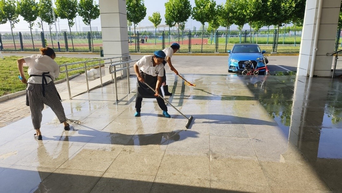 各中心工作人员每日做好学生公寓、教学楼、场馆(地)、学生餐厅等公共区域卫生清洁工作;加大安全巡查力度,全面做好我校安全稳定工作;学生餐厅不断丰富菜品,在做好食品安全工作的前提下,满足师生多样化需求;做好学校垃圾清运工作,日产日清,减少细菌滋生与传播;不断提高场馆服务保障能力,满足师生教学训练需要;加强水电燃气等设施设备检查,确保设施设备平稳运行,工作人员24小时在岗,确保我校供水、供电等发生突发状况时及时抢修,全力做好我校师生的服务保障工作。