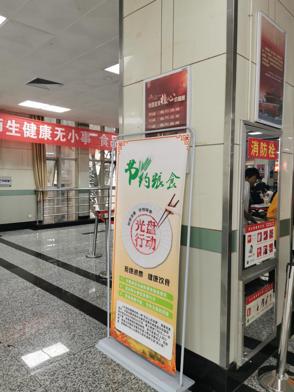 在学生餐厅明显位置张贴“节约粮食”“光盘行动”“文明用餐”等宣传标语,发出餐厅文明用餐、节约粮食的倡议,同时根据师生实际用餐情况,开设小份餐等,通过多种方式,积极引导师生培养勤俭节约、文明就餐的良好生活习惯,营造良好氛围。