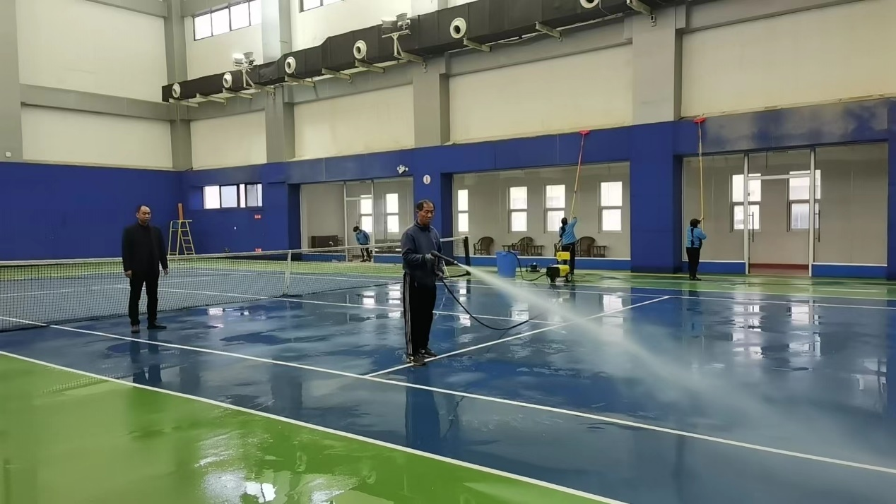 10月19日,后勤管理处(集团)教学保障中心组织工作人员对新网球馆进行全面清洁,为我校师生营造干净、整洁的教学环境。