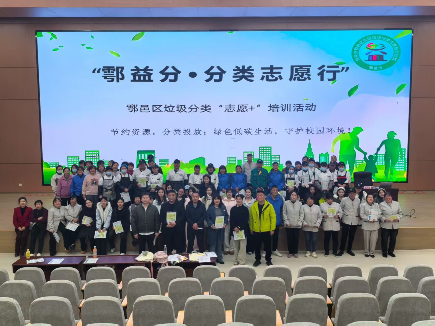 2025年11月27日(周四),在鄠邑区教学综合楼3楼报告厅,我们齐聚一堂,共同参与 “鄠益分 分类志愿行” 垃圾分类进校园主题活动。由学生代表若干、学生餐厅一至三楼餐饮公司一线员工、外围物业人员、公寓楼管等参加。出席本次活动的有鄠邑区垃圾分类中心副主任王维,鄠邑区垃圾分类中心宣传科科长刘振。