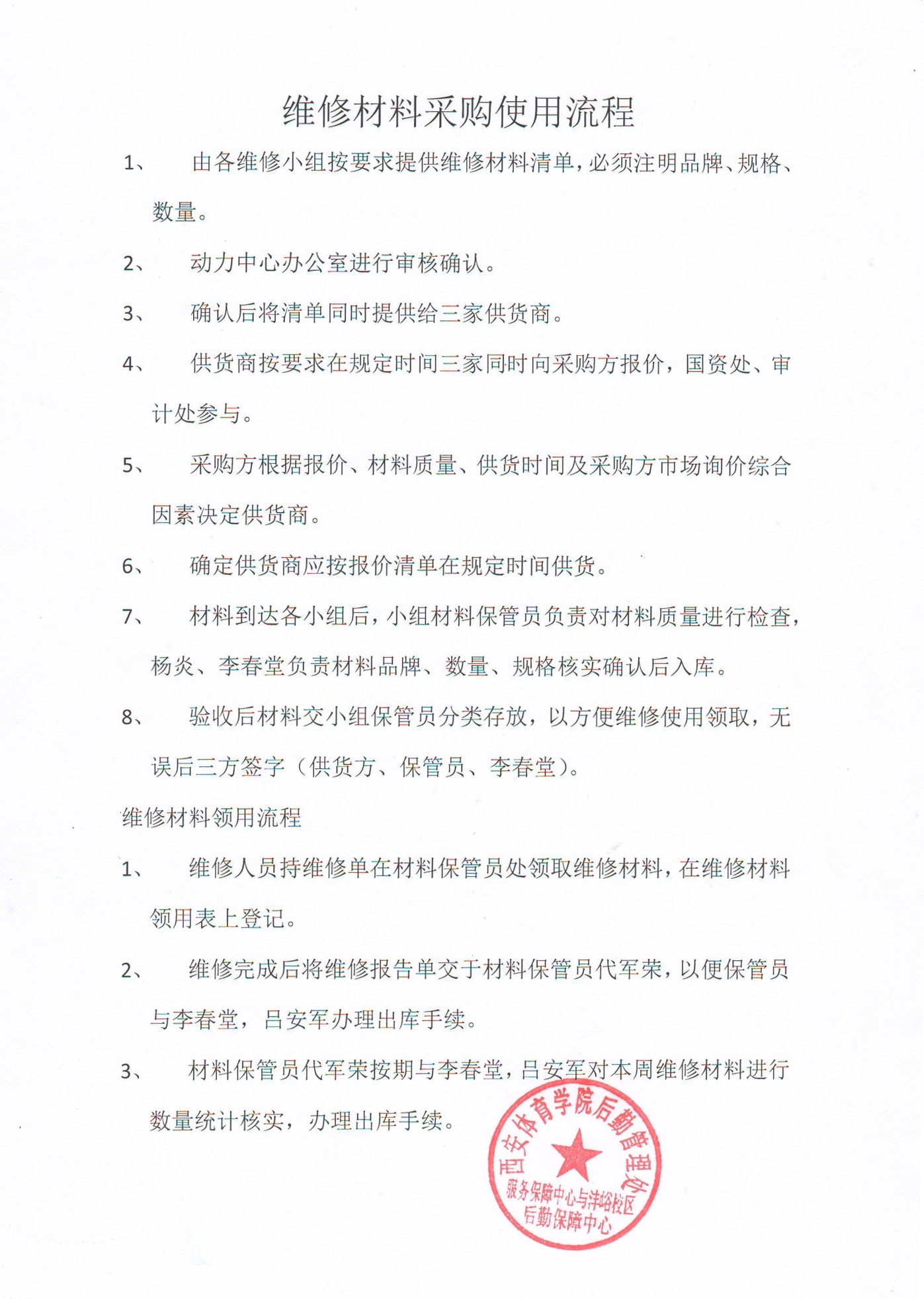 西安体育学院服务保障中心与沣峪校区后勤保障中心维修材料采购使用流程
