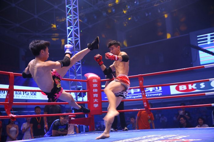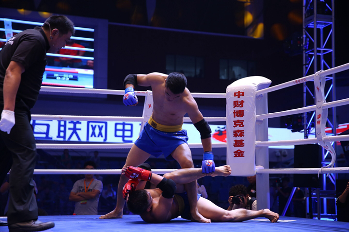 85公斤级的决赛作为压轴战,是在北京体育大学的张继凯与我院的青格乐之间展开。第一回合,青格乐便充分展现出全面的特点,无论直立还是地面都占据优势,张继凯完全落得下风,不过两次被击倒之后的张继凯在观众的助威声中两次顽强站起来,坚持完成第一回合。第二回合一上来,青格乐又是拳脚并用,张继凯的教练只好丢白毛巾认输,青格乐便以TKO获胜锁定冠军。