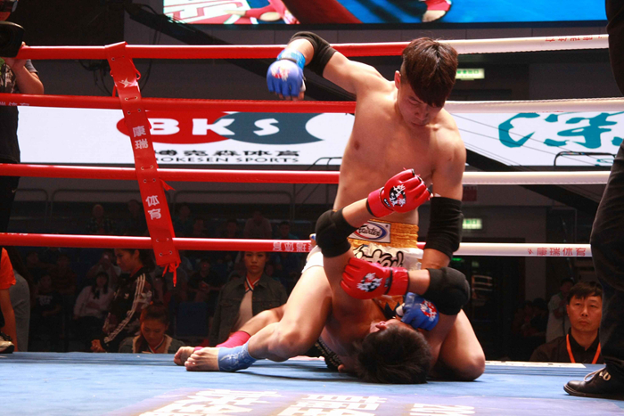 65公斤级比赛,代表武汉体育学院出战的张忠良与我院名将逯建波为争夺冠军头衔展开巅峰对决。第一回合,在地面战上,摔跤出身的张忠良没让逯建波占到便宜,不过大赛经验丰富的逯建波从容应对,不给对手抱摔机会,反而施以重拳击中张忠良的肋部,随即他又跟进右勾拳出击,遭到重创的张忠良倒地无法坚持。逯建波因此仅用时1分32秒便毫无争议的夺得冠军。