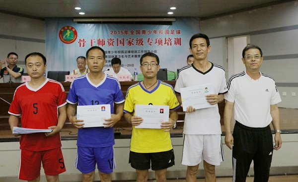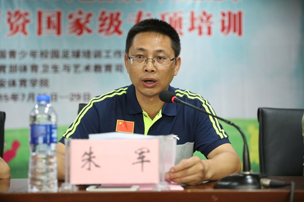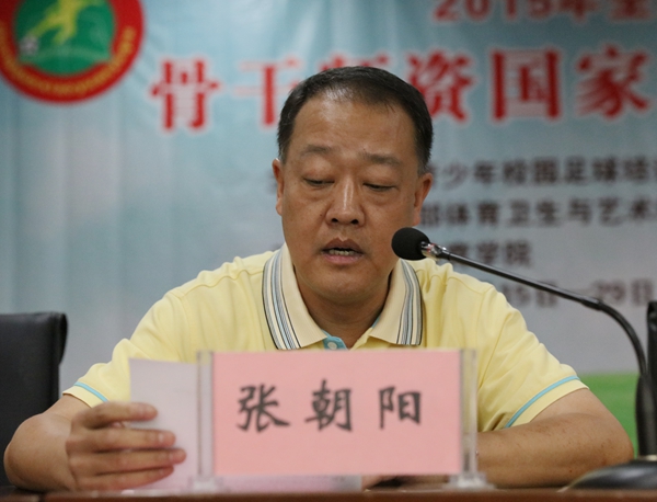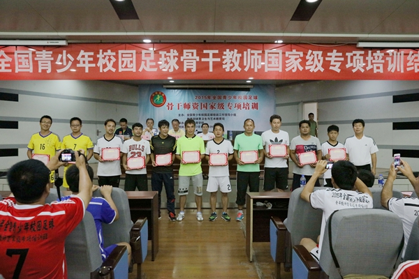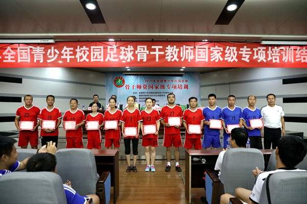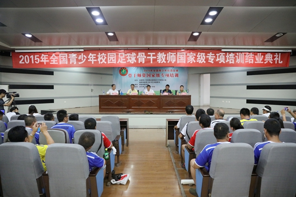 本网讯 7月28日,2015年全国青少年校园足球骨干师资国家级专项培训在新教学楼一楼报告厅圆满落幕,210名参训学员及授课教师齐聚一堂,举行了简短而隆重的结业典礼。党政办主任张朝阳、校园足球培训首席专家杨钢、后勤管理处(集团)处长许伟、足球发展改革办主任朱军参加了结业典礼。朱军主持活动并作培训工作总结。