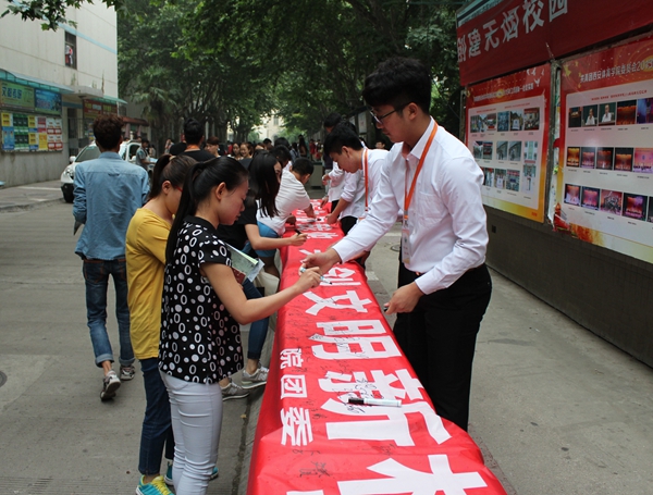 本网讯 6月16日中午11点30分在食堂西门,院团委、大学生自律委员会就“大学生文明行为养成教育专题的活动”举行了签字仪式。学工部部长王志刚,纪委副书记、学工部副部长缑荣涛,学工部副部长、团委负责人郑璐,学工部副部长李育红,团委副书记王鹏参加了活动。