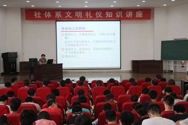 本网讯 为进一步提高学生综合素质,增强学生的文明意识,提高学生的文明素养,社会体育与休闲体育系于6月10日特邀体育传媒系教师王瑞作为主讲教师,在教学楼五楼报告厅为同学们举办了“文明礼仪”知识讲座活动。系党总支书记吴晓涓、副主任杨建设、各年级辅导员及全系学生参加了讲座活动。
