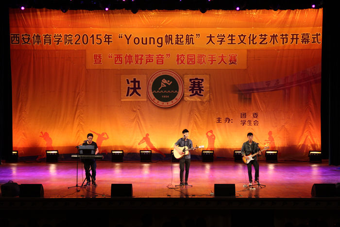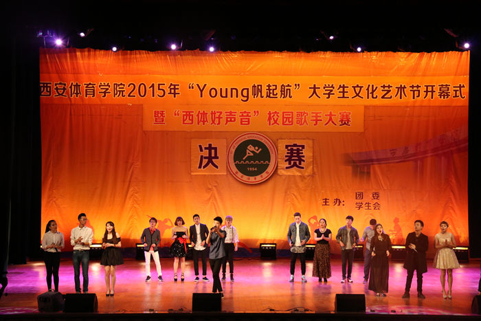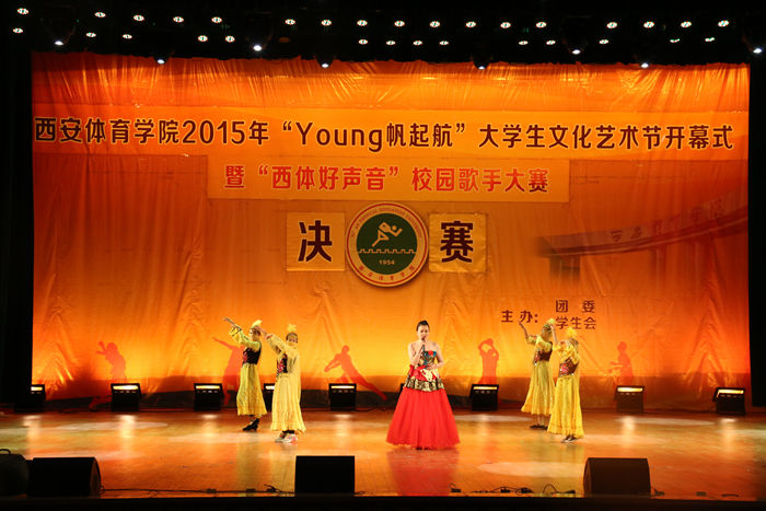 本网讯4月16日晚,我院2015年“young帆起航”大学生文化艺术节开幕式暨“西体声音”校园歌手大赛决赛在大礼堂拉开帷幕。副院长文立新、组织部部长雷甲谋、教务处处长刘新民、组织部常务副部长郭春玲、运动训练系党总支书记张卫国、健康科学系党总支书记刘勇、武术系党总支书记梁咏梅、体育艺术系党总支书记李美霞出席了活动。西安音乐学院团委书记王文霞、西安美术学院团委副书记贾鹏龙、西安医学院团委副书记王文鵷、2011级体育艺术系团总支书记黄宏叶、音乐教研室张惠老师应邀担任本次比赛评委。