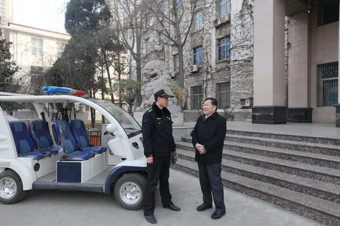 最后一站来到西大门门岗值班现场,院领导给大家拜早年!吴长龄、周里同志指出:校园内部安保工作十分重要,安保人员工作很辛苦,门卫值班、巡逻工种几乎是半野外性质,因此保卫处、后勤管理处要注意做好安保人员自身的防寒取暖。同时要求:节日期间,保卫处和后勤管理处要切实负起责任,强化值班制度,做好进出校外人员的查问,围绕燃放烟火爆竹专题做好消防安全工作,增加夜间巡逻频次,为平安校园建设做贡献。
