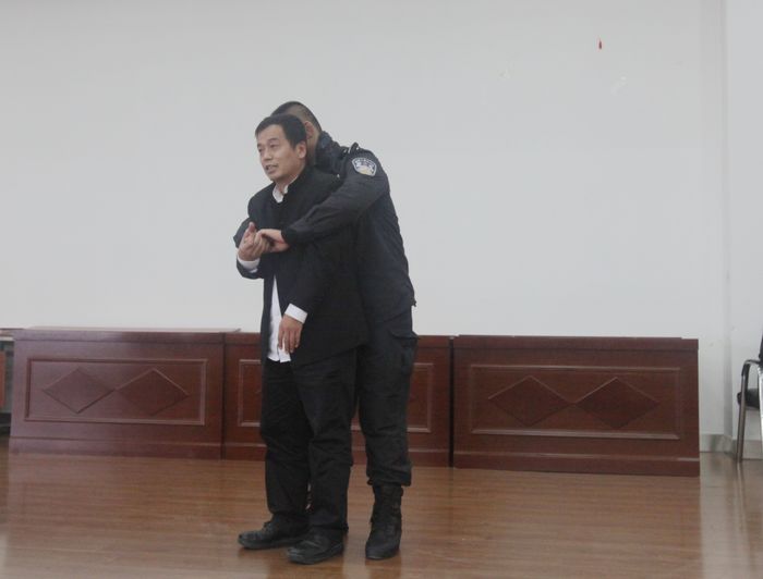 为增加现场互动,马文国主任请来西安市特警支队两位警官携带武器模型及警用设备参与讲座。在技能演示环节,马文国主任和两名特警现场演示了结合女性生理和心理特征的一些防身术,技法简单、实用、杀伤力强。马文国主任指出:在遇到袭击和不法侵害的时候,可以利用身边的任何器物作为武器,例如衣服、皮包、茶杯甚至钢笔等,进行正当防卫。马主任精深的武学造诣和深厚的技击功力赢得了同学们阵阵喝彩。