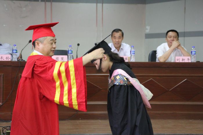 周里院长为毕业生颁发毕业证并正冠拨苏