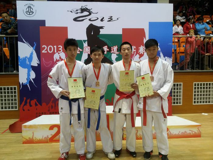 我院派出了由武术系主任马文国为领队,重竞技教研室马波副教授为主教练的5名队员参加角逐。最终获得1金1铜的优异成绩,其中体育经济与体育管理系2010级学生路璐(下图左三)获得金牌。这是我院空手道队乃至西北地区空手道项目在全国顶级赛事中获得的首枚金牌。