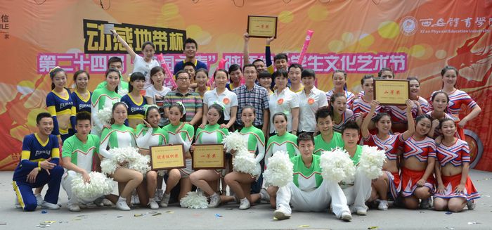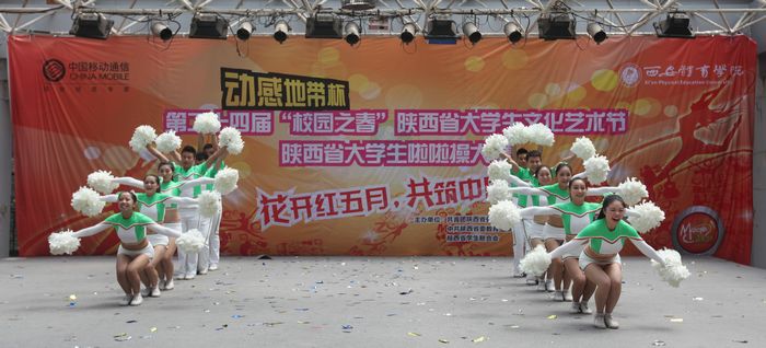 本网讯6月5日下午,由团省委、省教工委、省学联主办,我院团委承办的第二十四届“校园之春”陕西省大学生啦啦操大赛在我院大学生活动中心举行,全省13所高校代表队参加了比赛。大赛特邀全国啦啦操裁判许波、陈西玲、张蕊担任评委。