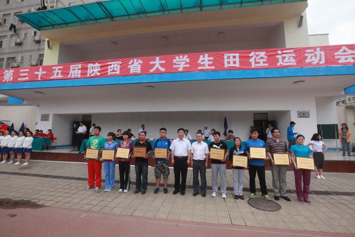 陕西省政府教育督导团总督学曹普选(左六)、周里副院长为获得“道德风尚奖”代表队颁奖