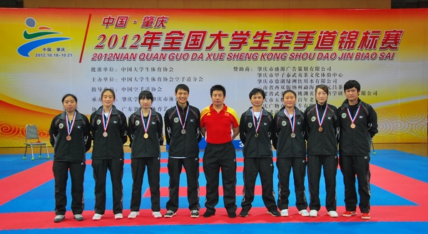 本网讯由中国大学生体育协会空手道分会主办的2012年全国大学生空手道锦标赛日前在广东省肇庆学院举行。全国包括香港大学在内共41所学校432名运动员参加了此次比赛,我院空手道队在领队赵学军、主教练马波的带领下发扬团结协作、勇于拼搏的精神,获得3枚金牌、4枚银牌和2枚铜牌,并获得男子团体和女子团体第三名的优异成绩,我院空手道队还被评为“体育道德风尚奖”代表队。