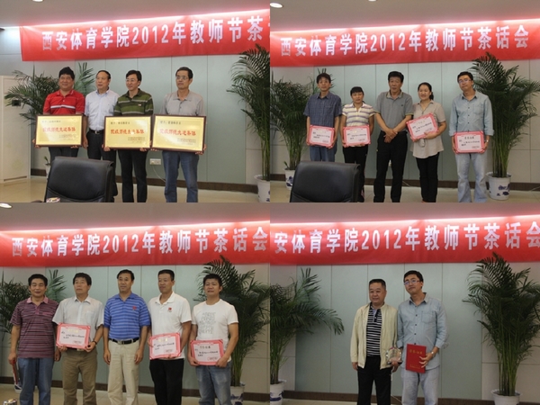 茶话会上首先进行了师德先进和参加陕西省青年教师教学竞赛获奖人员的表彰。院工会副主席查晓峰宣读了陕西省教育厅、陕西省教育工会委员会《关于表彰2012年陕西省师德标兵 先进个人和先进集体的决定》和《西安体育学院关于表彰2012年师德先进的决定》,教务处处长刘新民宣读了陕西省教育厅、陕西省教育工会委员会《关于高校青年教师教学竞赛获奖人员的表彰决定》,院领导分别给获得院级师德建设先进集体、师德先进个人和参加陕西省青年教师教学竞赛获奖人员颁发了奖牌、荣誉证书、奖杯和奖金。
