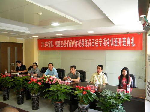 本网讯 为提高新疆、西藏及四川、云南、甘肃、青海四省藏州体校教练员的执教水平,按照中华全国体育基金会援疆援藏工作总体安排,由中华全国体育基金会、中国田径协会主办,我院承办的2012年新疆、西藏及四省藏州体校教练员田径专项培训班6月4日上午在国际交流中心会议室举行了开班典礼。