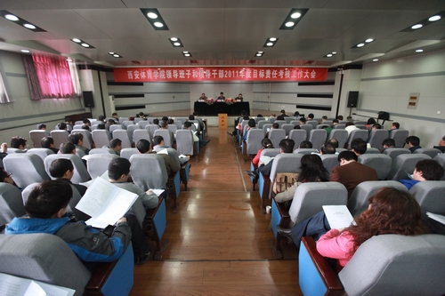 本网讯为进一步加强高等学校领导班子和领导干部队伍建设,改进和完善干部考核评价工作,根据省委、省政府有关要求,3月30日,我院在教学楼一楼报告厅召开西安体育学院领导班子和领导干部2011年度目标责任考核工作大会。陕西省高等学校年度目标责任考核西安体育学院考核工作组组长、省体育局纪检组组长支希贤,省体育局人事处处长马新范,省委组织部宣教处副调研员周群以及考核小组成员可宗革、高志国、甄颖出席大会。学院党委委员、纪委委员、学术委员会委员、工会委员,正高职称专业技术人员,副处级以上干部,市级以上人大代表、政协委员,各民主党派主要负责人,学生代表近150人参加了大会。大会由学院党委书记杜平主持。