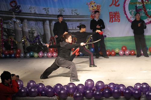喜庆洋洋的舞狮表演拉开了晚会的序幕。在武术系主任马文国发表了热情洋溢的新年贺词后,节目演出正式开始。