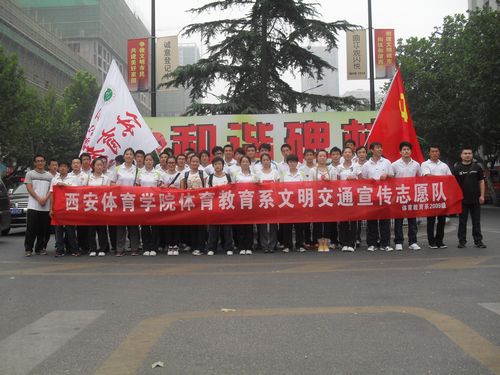 为积极配合学院创建工作,响应西安市政府“平安世园”的号召,树立西体学子文明礼貌新形象,2011年9月,我院体育教育系2009级全体学生党员参加了由该年级与碑林交警大队共同组织举办的文明交通宣传活动,分别在碑林区人流量较大的南稍门、李家村、大差市、端履门四个十字路口进行志愿服务,对闯红灯、乱穿马路、跨越护栏等不文明行为进行劝导。