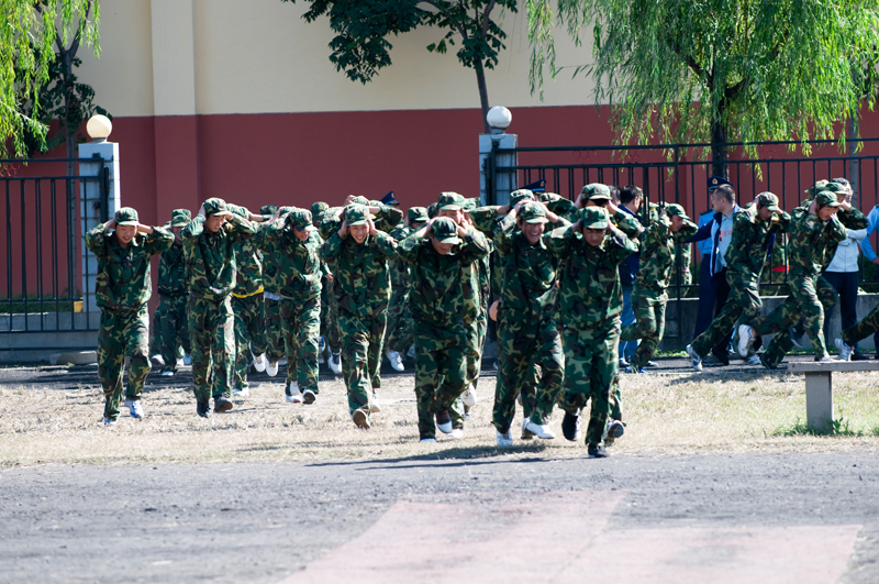 上午10时30分,随着防空警报的响起,学生们按照演练方案,以连为单位在承训教官和校区工作人员的指挥、协调下,有序地疏散至田径场及足球场的指定集结地。各连根据方案,清点人数向指挥部报告,演练圆满结束。