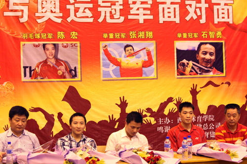 2010年6月25日—28日,陈宏、张湘翔、石智勇三位奥运冠军在福建省龙岩市体育局邱应龙局长的陪同下访问了我院。周里副院长代表学院对他们一行的到来表示了热烈的欢迎。