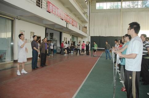 我院首届教职工网球赛于5月19日晚六点在网球馆正式开赛。院长苏明理、党委副书记朱元利、副院长雷新声等领导出席开赛仪式。仪式由院工会副主席李建华主持。朱副书记在讲话中要求有关组织单位和裁判员在比赛和执裁中做到公平公正,有序比赛,希望广大参赛队员赛出风格,赛出友谊。苏院长在致辞中指出,在全民健身时代,体育学院要起到带头作用,推广普及大众运动项目。讲话最后,苏院长愉快地宣布比赛开始。