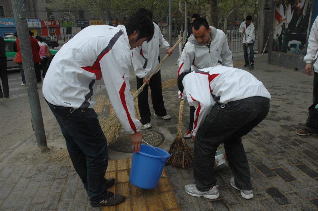 为保护我们的环境贡献一份力量,同时响应区政府、张家村街道爱卫办号召,我院体育系、运动系、武术系、社体系、人文学系、人体系数以百计的师生志愿者身着校服,有组织有纪律地在含光路部分路段进行了擦洗公共设施,清扫沿街道路等活动。