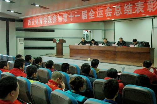 苏明理院长在讲话中代表学院党政向在全运会决赛中取得优异成绩的我院运动员、教练员表示热烈祝贺。他指出,我院在本届全运会取得的良好成绩主要得益于扎实的思想政治工作、扎实的工作作风、扎实的业务水平和扎实的责任意识。“成绩已载入史册,未来还须拼搏,”苏院长强调,在新的备战周期,学院将坚持教学、训练、科研“三位一体”的办学模式,继续高度重视和支持竞技体育;巩固重点优势项目,发展潜优势项目,支持非奥项目;坚持训练和运动队管理模式创新;坚持体育科研为运动训练实战服务。苏院长就今后竞训工作提出四方面要求:一是制订学院竞赛训练规划,建立长效机制,保持竞技体育的可持续发展;二是坚持“科学技术是第一生产力”的指导思想,充分发挥体育科技对运动训练的先导和保障作用;三是坚持训练创新;四是坚持管理模式创新。苏院长最后号召在座师生努力进取,再接再厉,力争在伦敦奥运会和十二运会上取得更加优异的成绩。