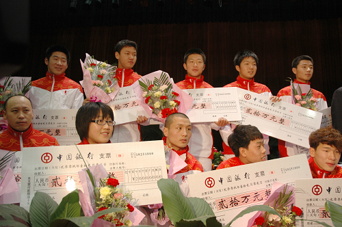 陕西省参加全国十一运会表彰奖励大会于12月2日上午在曲江会议中心隆重举行。陕西省省委书记赵乐际、陕西省省长袁纯清等领导同志出席大会。会上,省委省政府为获得奖牌运动员、教练员及训练、输送单位等颁发丰厚奖金,同时为17名获得金牌的运动员和8名教练员各记一等功一次。
