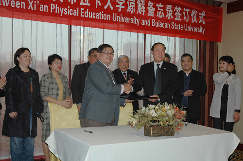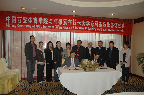 10月21日下午,菲律宾布拉卡大学校长马瑞诺·C· 迪杰斯博士率团访问我院,院长苏明理教授在亲王府饭店热情接待了布拉卡大学代表团一行,双方签署了《中国西安体育学院与菲律宾布拉卡大学谅解备忘录》。参与会见的还有我院武术系主任陈亚斌教授、徐瑛副教授等。