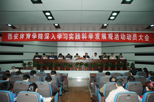 2009年3月25日下午,我院深入学习实践科学发展观活动动员大会在教学楼一楼报告厅隆重举行。陕西省委深入学习科学发展观领导小组第六指导检查组副组长简林根同志,干事王卫任同志,我院党委书记杜平,院长苏明理,党委副书记朱元利,党委副书记、纪委书记苏义民,副院长权德庆、雷新声、周里及党委委员刘新平,陈彦在主席台就座。全院各党总支、党支部书记,科以上领导干部,正高职称专业技术人员,教职工党员代表,离退休党员代表,学生党员代表等近三百人参加了大会。动员大会由苏院长主持。