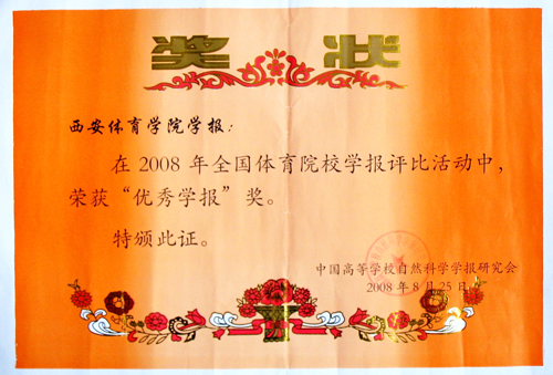 全国体育院校学报研究会第20届年会暨建会20周年庆祝大会于2008年9月2日-8日在武汉体育学院隆重举行。在此次大会上,《西安体育学院学报》荣获由中国高校自然科学学报研究会颁发的“优秀学报”称号。