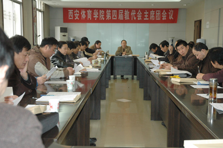 会议由本次教代会主席团团长、院党委书记董小龙主持。主席团副团长由苏明理院长担任。主席团成员由院领导、相关部门及各个分会代表团团长组成。全体主席团成员对我院第四届教代会第二次会议的议题和议程、《西安体育学院民主评议领导干部实施办法》及本次教代会提案工作委员汇报的提案征集情况进行了审议。