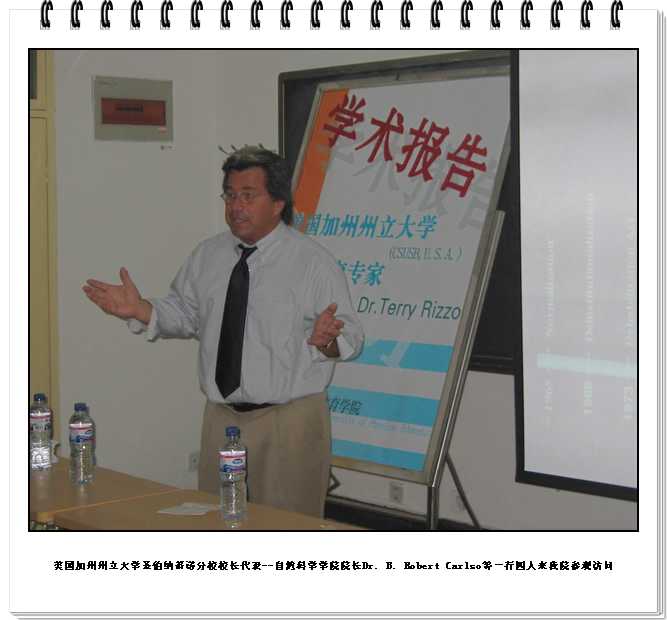 9月12--14日,美国加州州立大学圣伯纳蒂诺分校校长代表--自然科学学院院长Dr. B. Robert Carlso等一行四人来我院参观访问,并对两校在未来的合作项目、内容进行了洽谈。