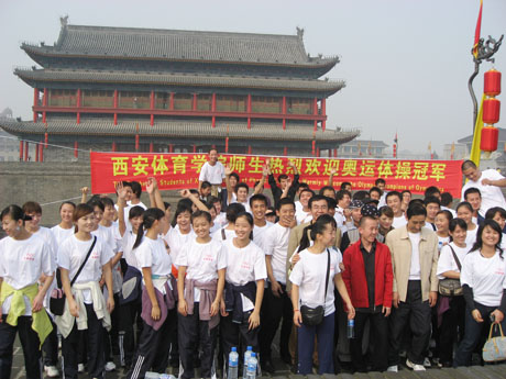 奥运体操冠军李小双、腾海宾、霍尔金娜、涅莫夫等人来到我院南门城墙欢迎方阵,与师生代表进行了亲密接触,共迎奥运。我院党委副书记朱元利代表学院向奥运冠军赠送了纪念品。我院师生以极大的热情欢迎奥运冠军的到来,表达了西体学子对2008北京奥运的热切期盼。