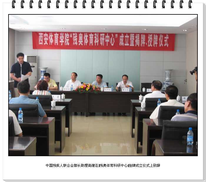 中国残疾人联合会部长助理高健代表中国残疾人联合会致词,这是西安体育学院为中国残疾人事业发展作的一件大好事,是中国残疾人体育事业的一个里程碑,标志着我国残疾人体育事业走向更加科学规范,对备战2008年北京残奥会和培养锻炼残疾人运动员有着重要作用。