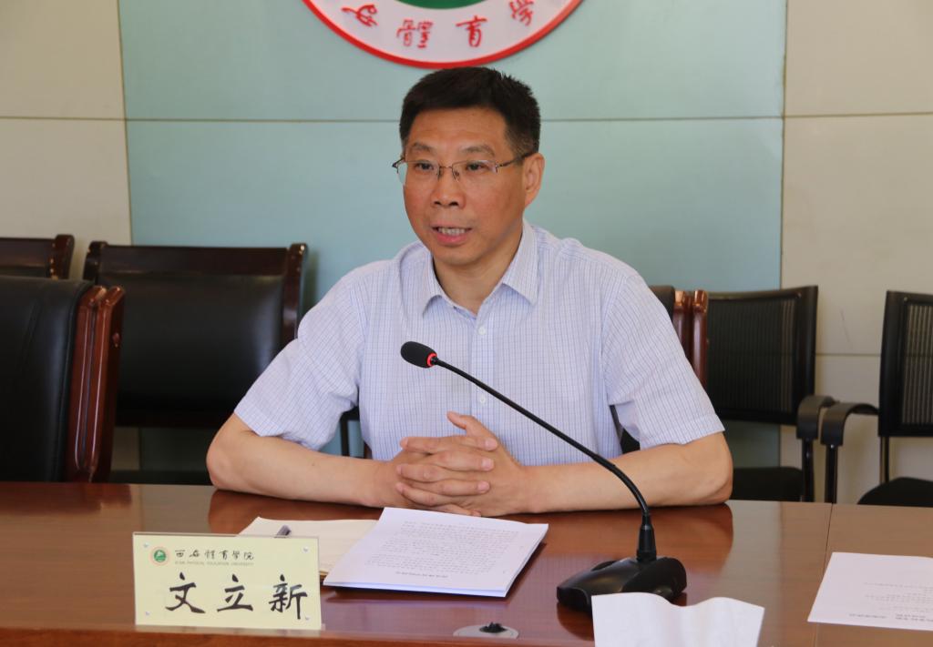 文立新对渭南技师学院一行的到来表示热烈欢迎。他从学校历史沿革、学科建设、科研发展、对外交流合作、岗位编制情况以及学校未来发展等方面进行了介绍。他谈到,人才发展是学校发展的基石,我校一向重视人才的聘用和培养,以高质量成果产出为导向,持续优化师资人才队伍,培养学科领军人才,打造创新团队,引培并举,以人才育英才;我校以“一院一策”为抓手,充分落实二级学院办学主体地位,布局谋划“一流专业、一流课程”建设,真正实现“放管服”;我校坚决推进和落实全员聘任和绩效考核制度,完善人才培养方案和定性、定量、定值考核指标,不断提高干部质量,提升干部能力,努力实现建设国家高水平教学研究型体育大学的目标。同时他也希望渭南技师学院能为我校传经送宝,提出宝贵意见。
