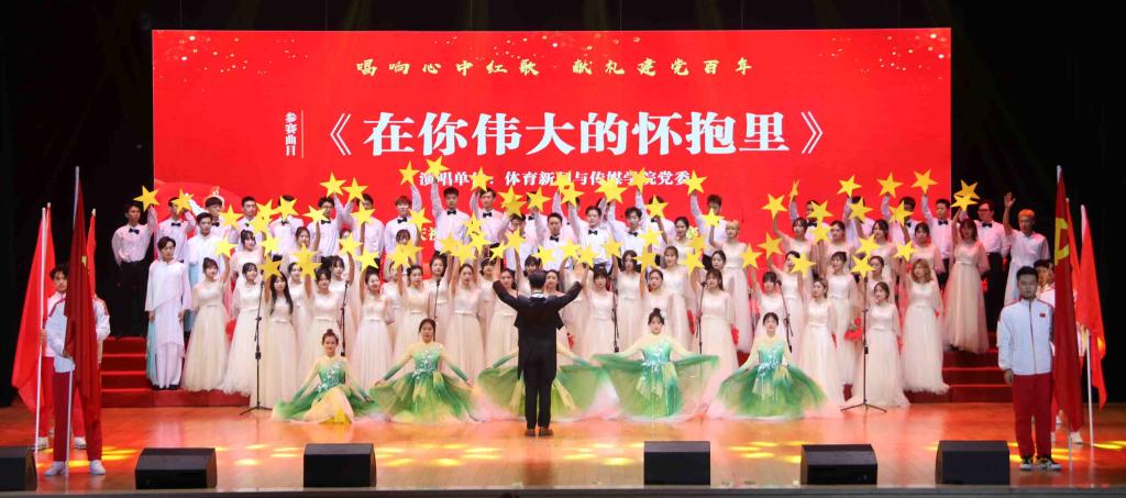 国旗飘动、舞姿翩然,传媒学子演唱的《在你伟大的怀抱里》等歌曲,把对党的热爱之情展现得淋漓尽致。