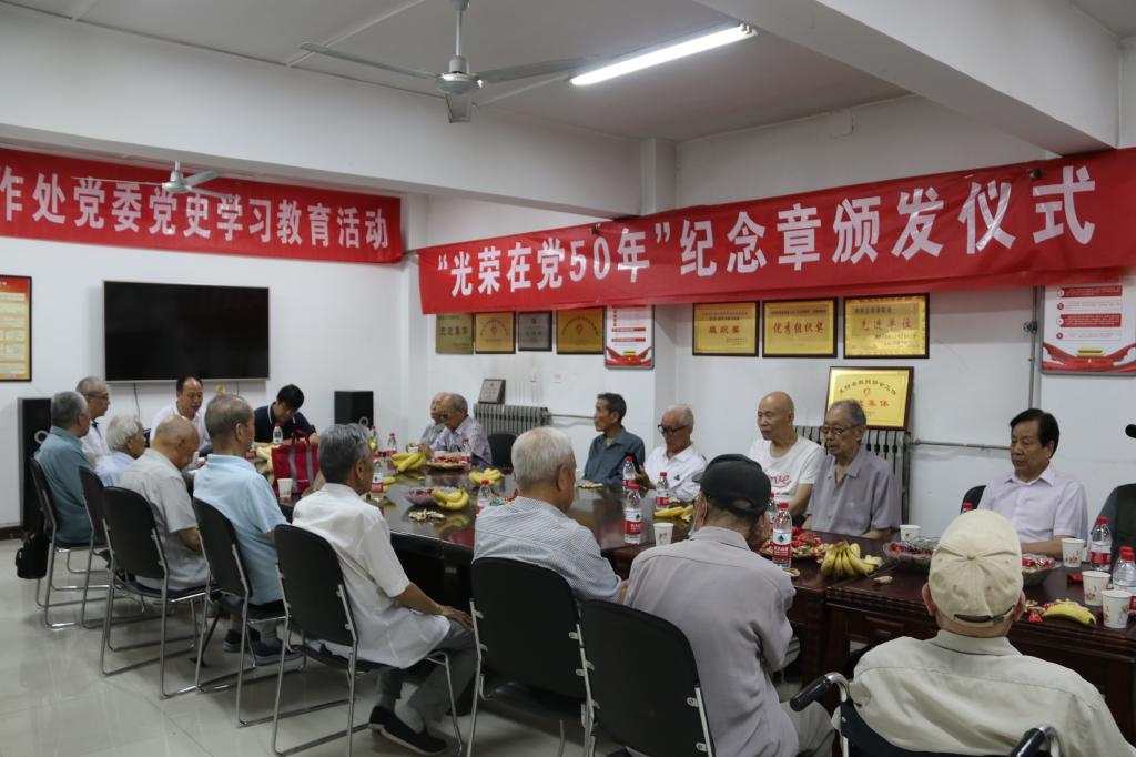 我校共有61名老党员获颁纪念章。离退休处副处长楚翠峰宣读了纪念章发放名单,黄道峻为党员代表一一颁发纪念章,并和大家亲切交谈。